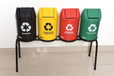 Estructura metalica reforzada. Pintura en polvo electroestática. Con 4 cestos Redondos de 14 lt c/u. de plastico inyectado virgen. Tapa vaivén que previene la dispersión de olores, evita el ingreso de insectos y reduce el ingreso de agua. Colores y simbología + texto según tipo de residuo (colores a elección).